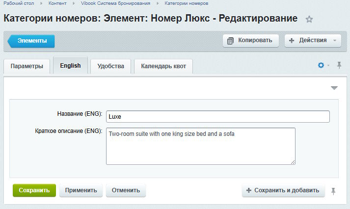 - Краткое описание (ENG). Краткое описание номера на английском языке, выводится в английском интерфейсе модуля. Если не задано, будет использоваться основное поле Краткое описание.