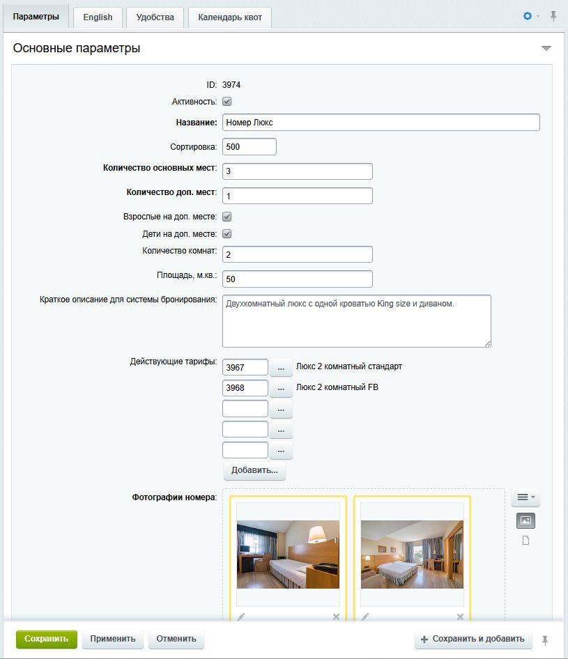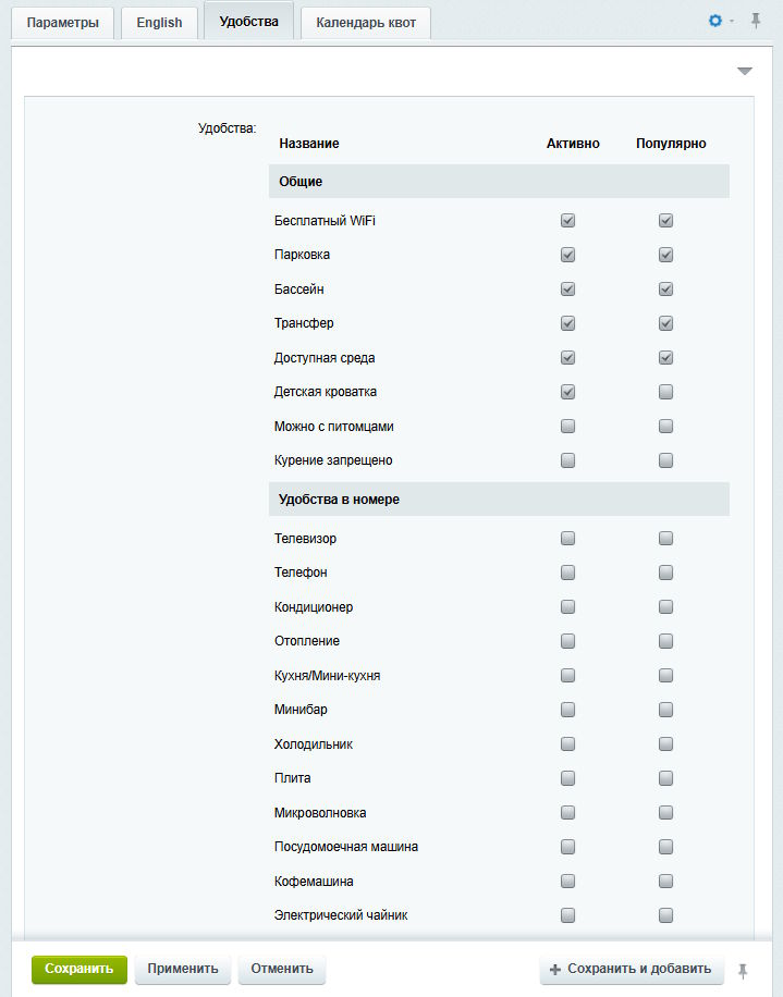 - Активно. Флагом помечаются все удобства, которые есть в номере. Все удобства, отмеченные флагом, отображаются во всплывающей форме "Услуги и сервисы" по клику на карточке номера.
