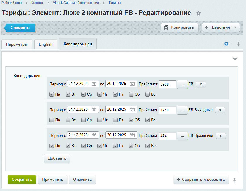 - Заданные в календаре цен периоды могут пересекаться, при этом дни недели пересекаться не должны.