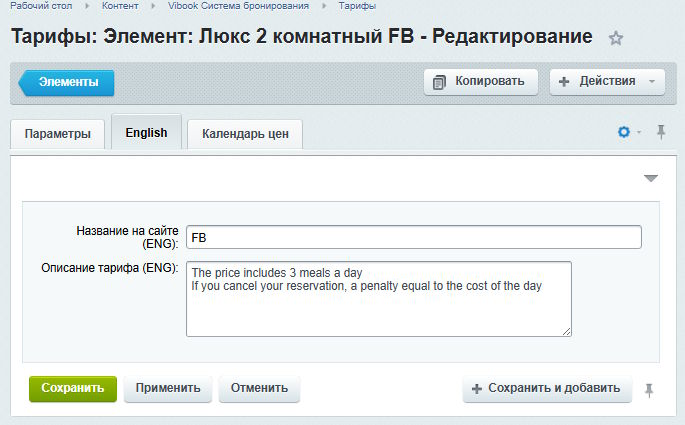 - Невозможно бронирование по данному тарифу на даты вне периодов, заданных в календаре цен.