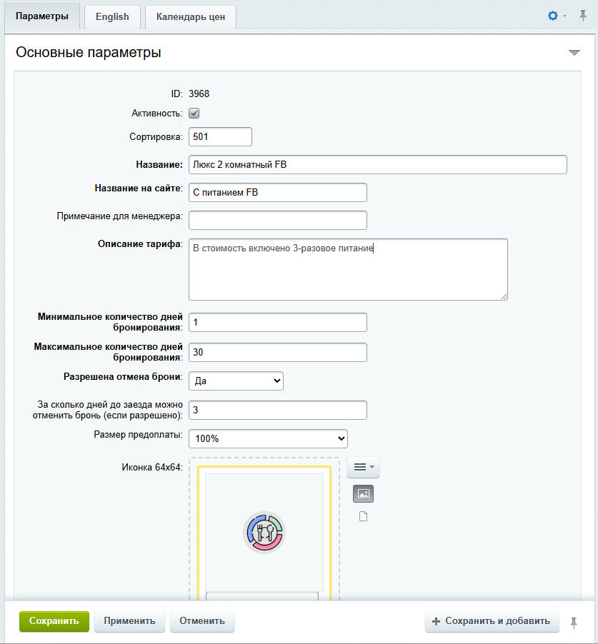 - Иконка 64х64. Изображение выводится в карточке тарифа на шаге выбора тарифа при бронировании. Если не задано, выводится изображение по умолчанию.