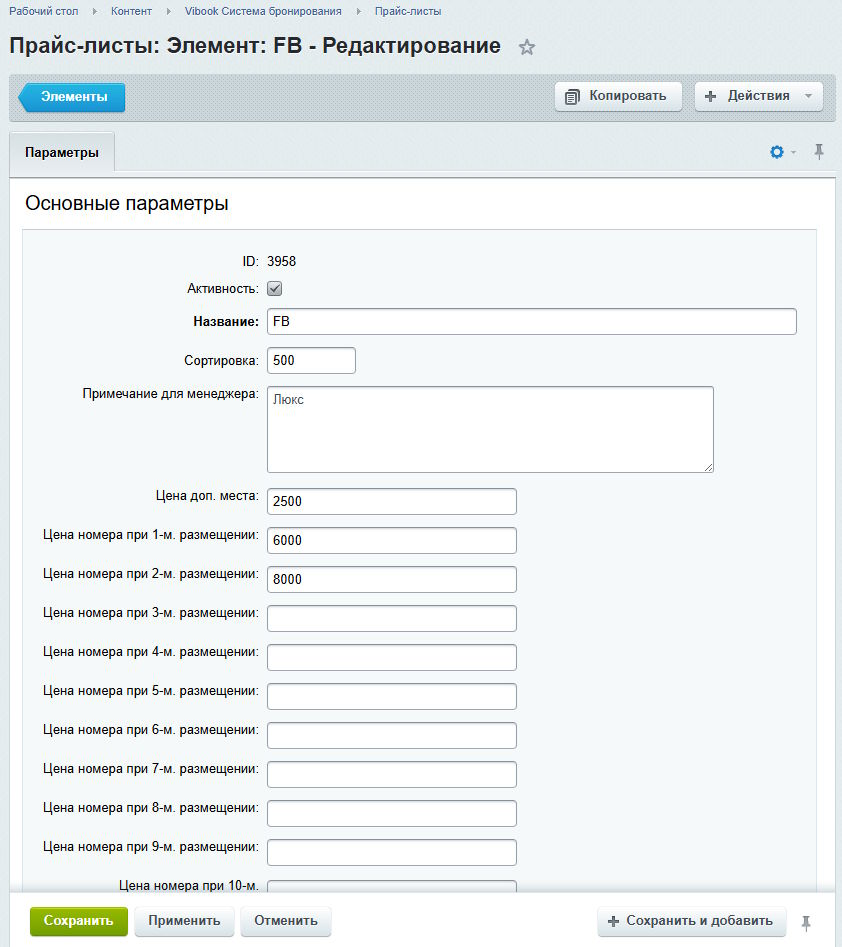 - Цена доп. места. Используется для расчёта стоимости доп места, если для номера задано поле "Количество доп.мест". Если в поле указано 0, система будет считать, что доп. место предоставляется бесплатно. Если поле не заполнено, система посчитает, что доп. место недоступно.